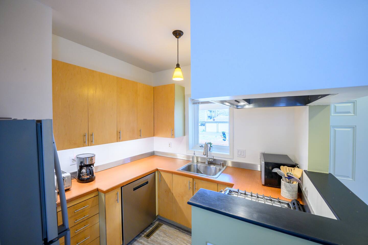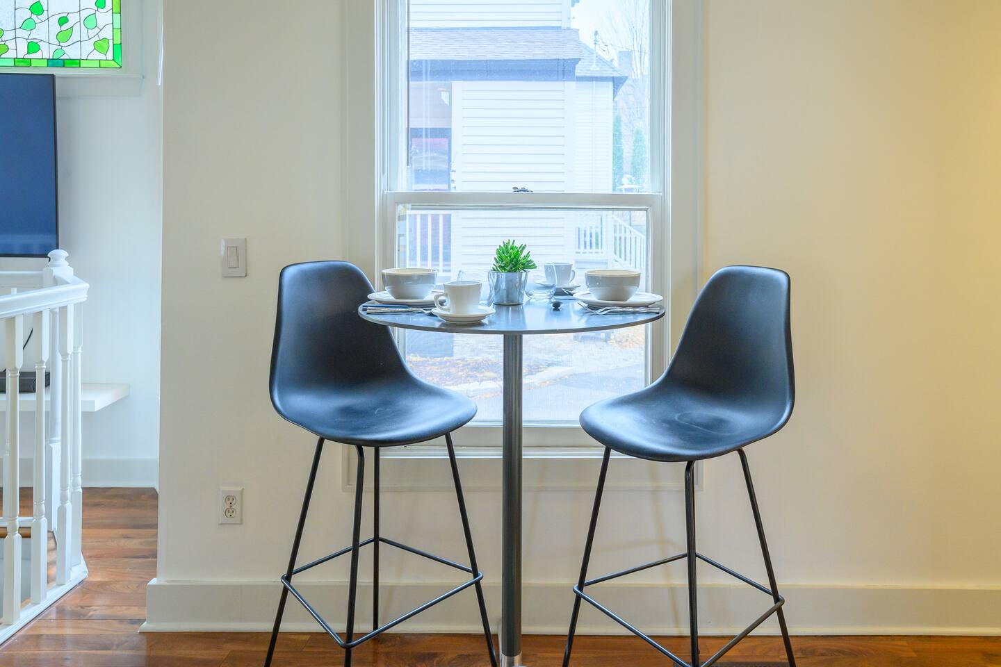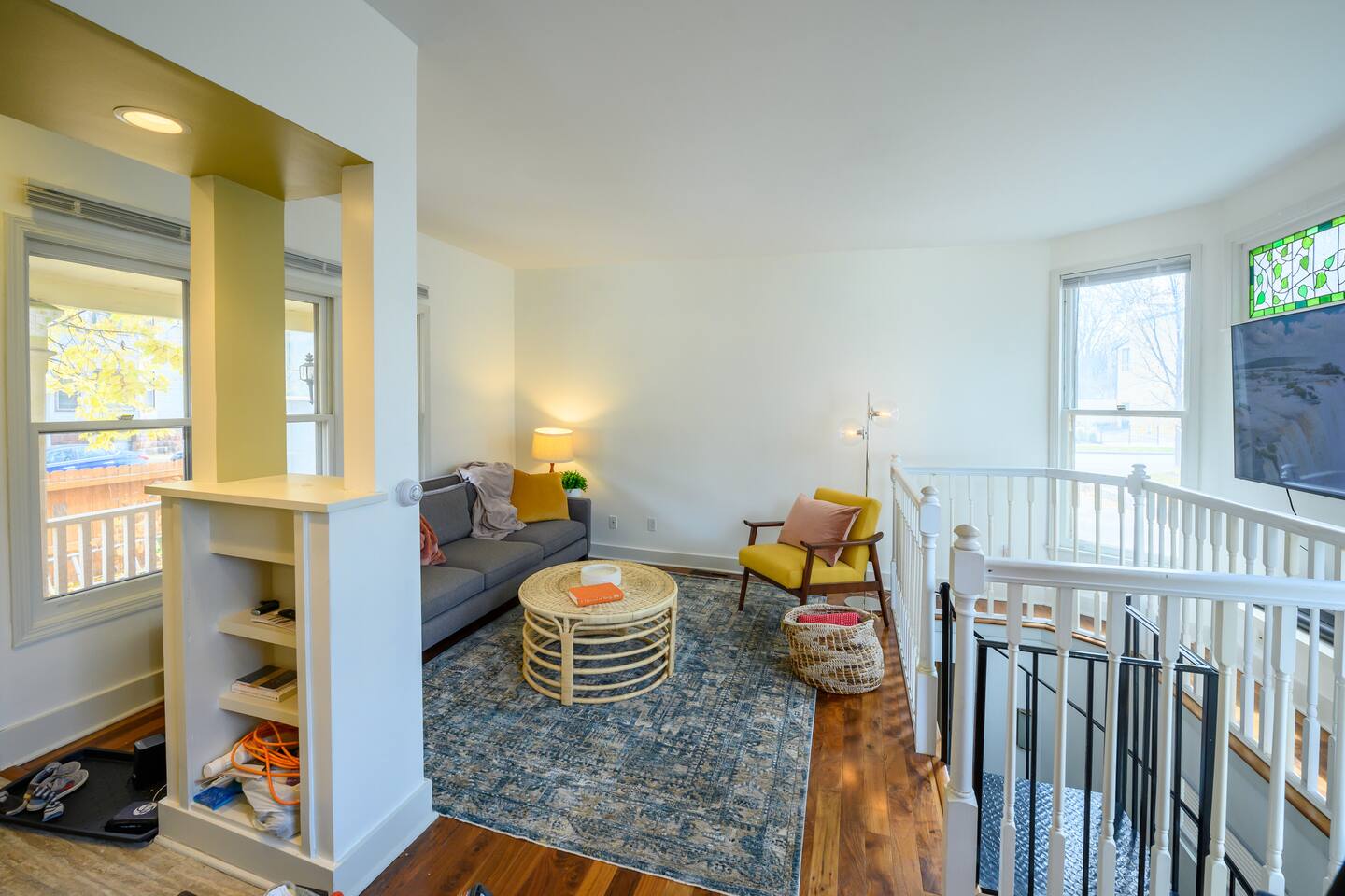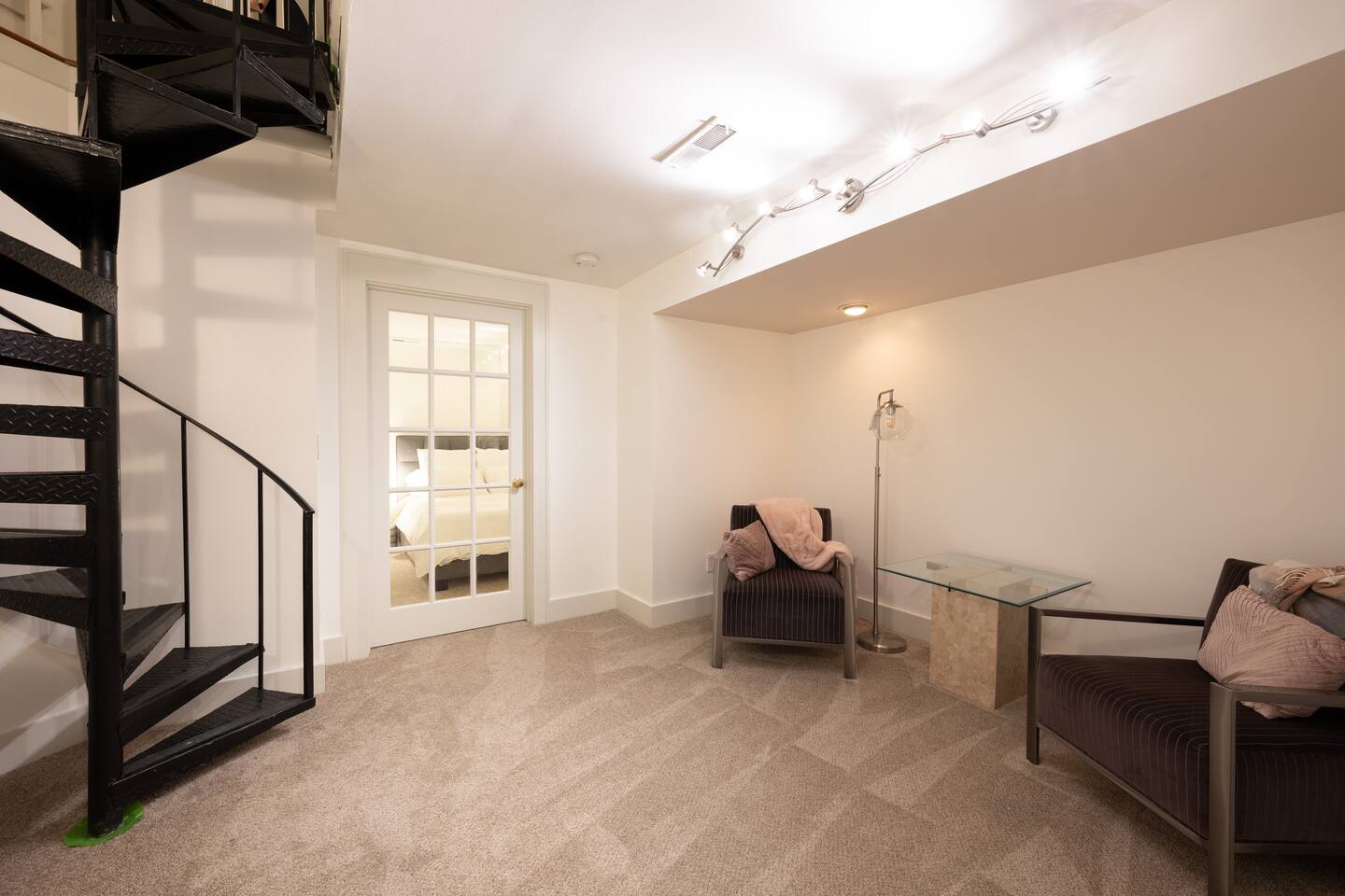 On the main level, you’ll find one bed and one bath, the living room, and the kitchen. The lower level is accessed via a spiral staircase and features one bed and one bath, a den area, and the laundry. Outside, the porch and patio is in our fenced-in yard. Please note the yard may be shared with tenants of a neighboring Airbnb unit.