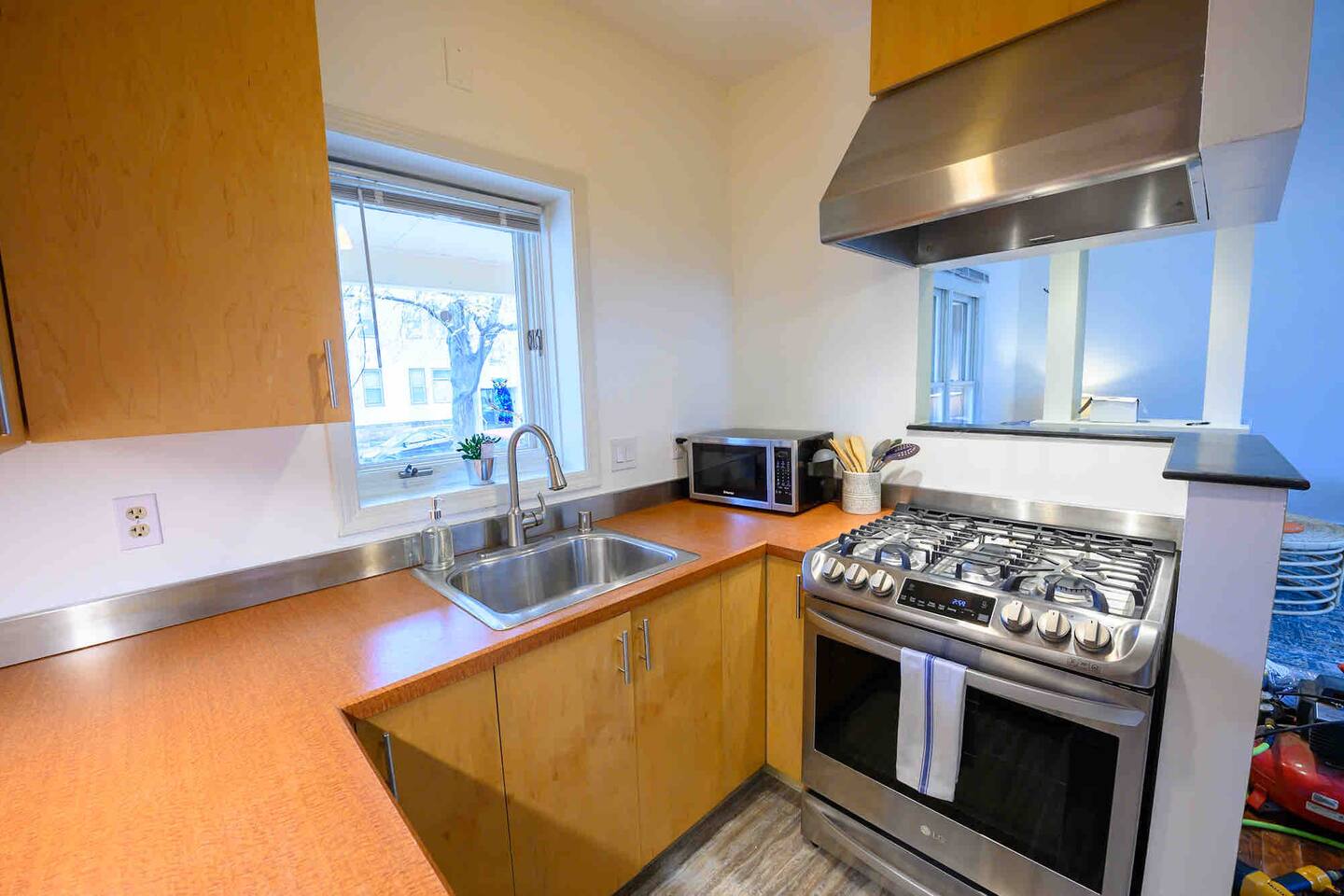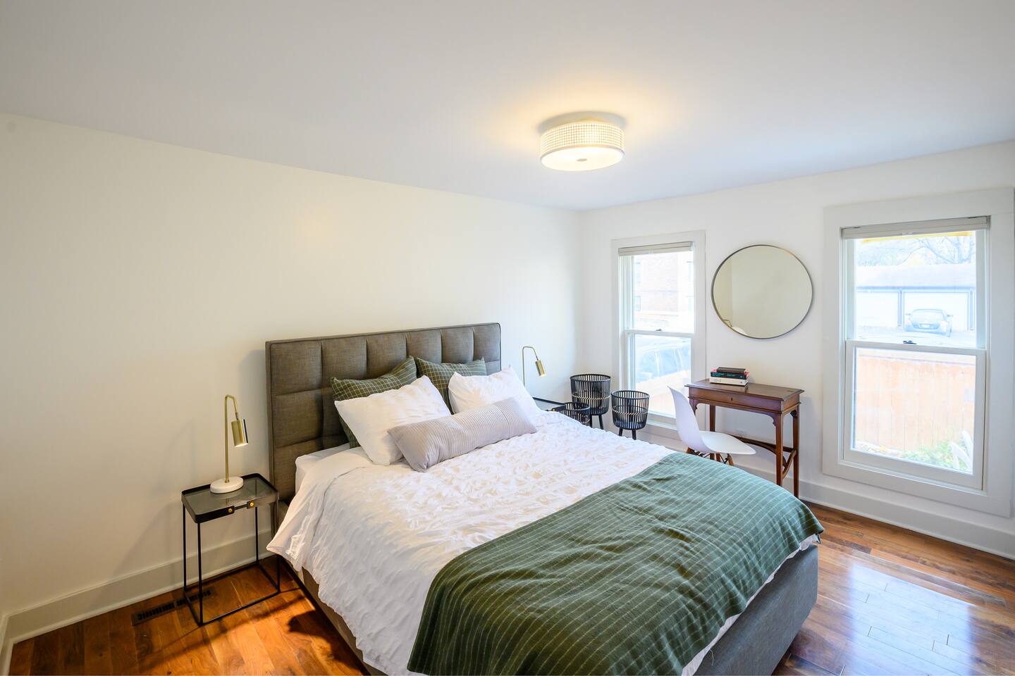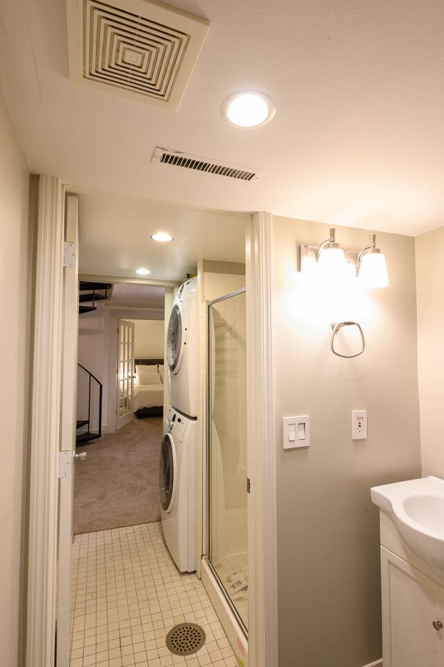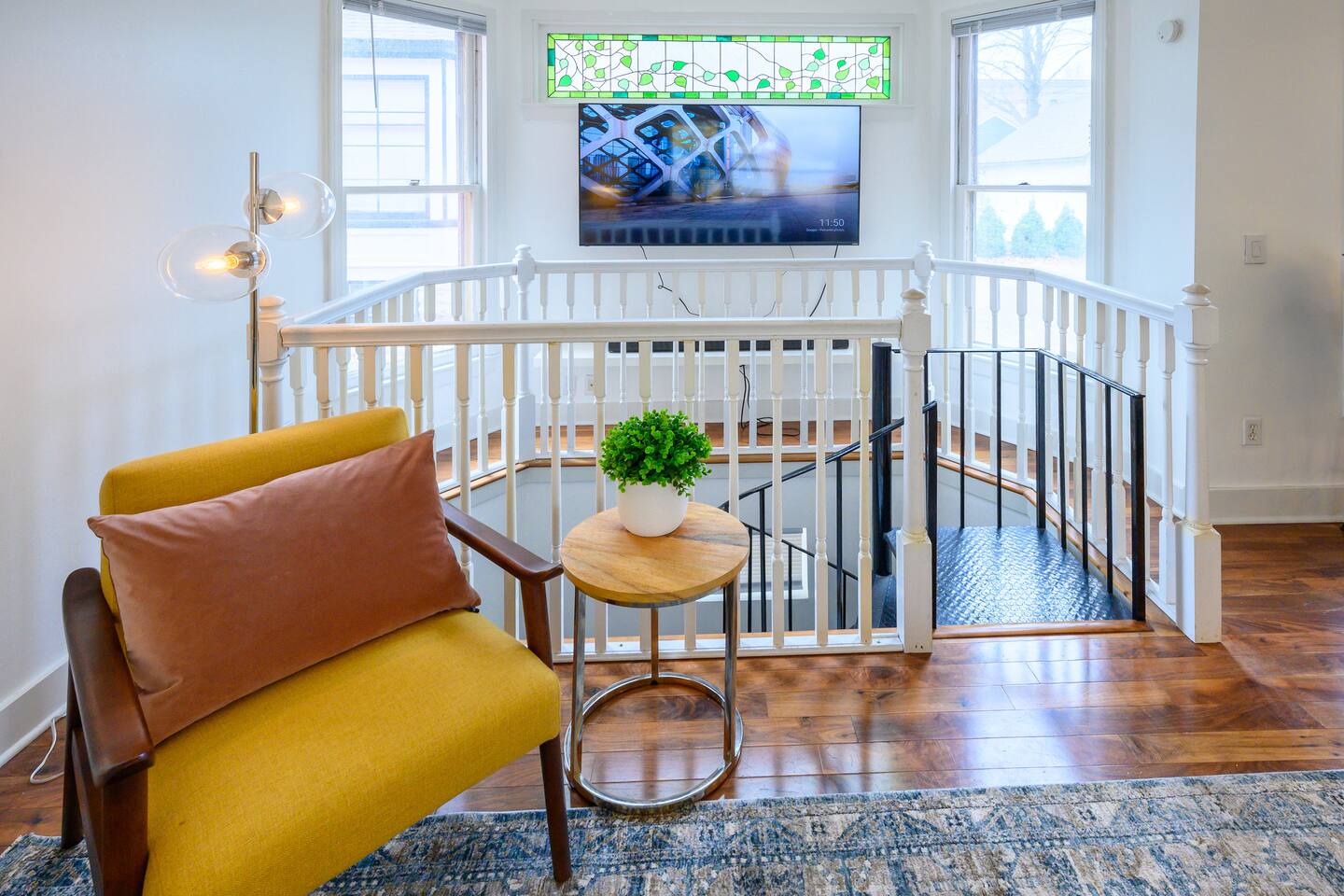 On the main level, you’ll find one bed and one bath, the living room, and the kitchen. The lower level is accessed via a spiral staircase and features one bed and one bath, a den area, and the laundry. Outside, the porch and patio is in our fenced-in yard. Please note the yard may be shared with tenants of a neighboring Airbnb unit.